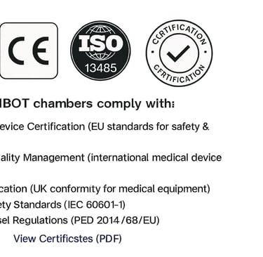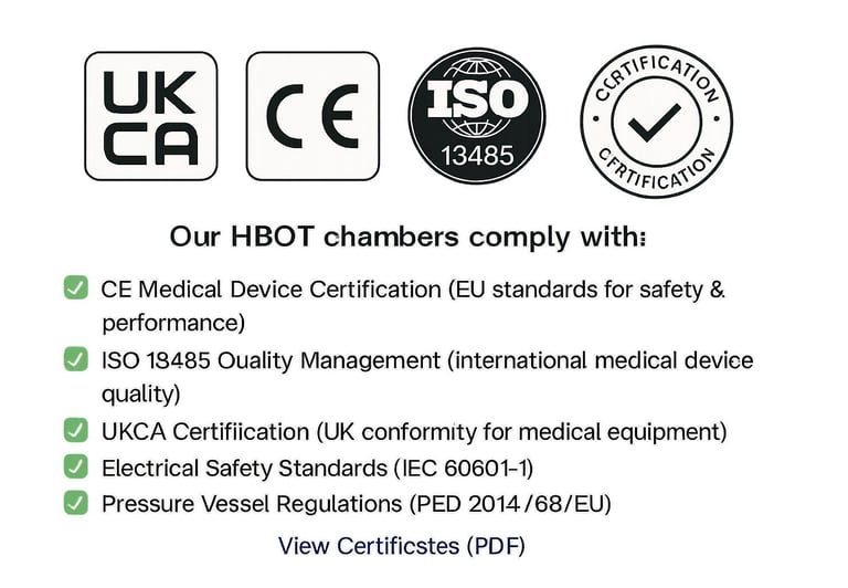 At Oxyvate, safety and quality come first. All of our Hyperbaric Oxygen Therapy (HBOT) chambers are manufactured in facilities that meet international medical device standards and comply with EU/UK regulations.