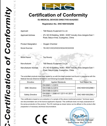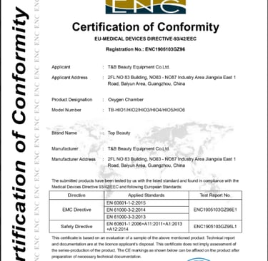 Every Oxyvate chamber is independently tested and certified under the EU Medical Devices Directive (93/42/EEC). This includes compliance with essential safety standards:EN 60601-1 (Medical Electrical Equipment Safety)